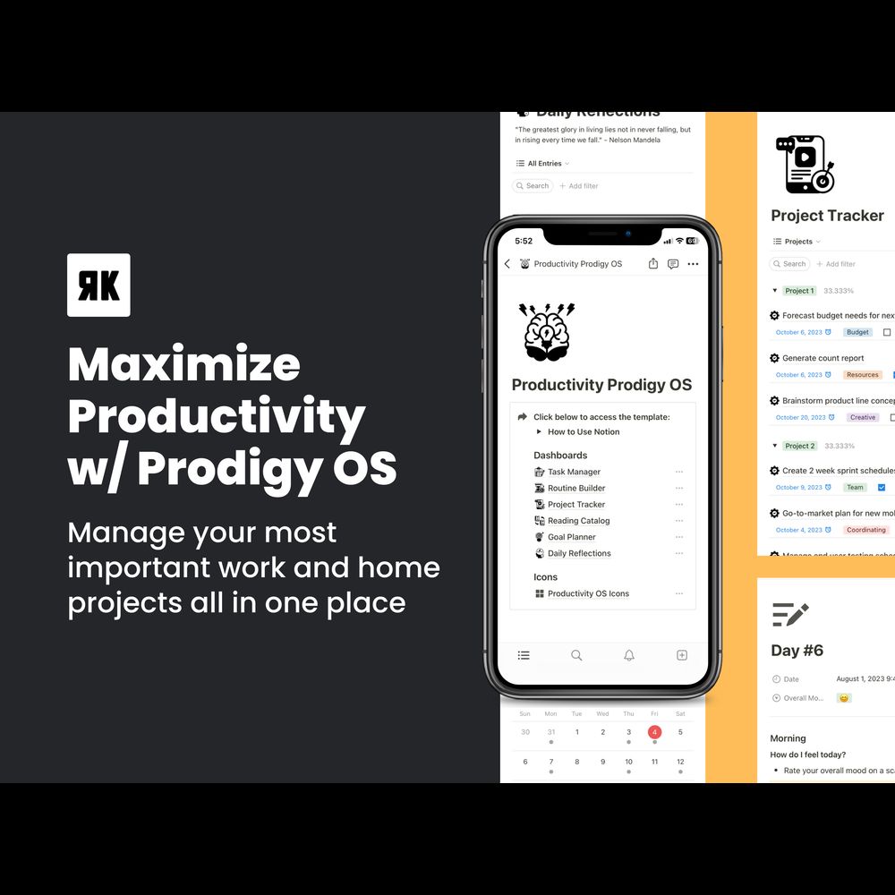 The ultimate template for getting your life in order. Tired of constantly juggling tools to manage work projects and personal goals? We created an all-in-one solution: ✓ Visualize and strategize goals ✓ Build positive habits ✓ Track tasks and projects ✓ Journal for self-awareness ✓ Catalog your reading What's Included? Goal Planner: Visualize and strategize your goals in Notion, outlining the steps to achieve them, and keep track of your progress. Have a clear roadmap every month for goal achievement, increased motivation, and focus.Daily Reflections: Journal and reflect on each day with prompts to enhance self-awareness and personal growth.Reading Catalog: Keep track of the books you want to read, books you have read, and books you recommend in one place.Project Tracker: Manage all work projects on one page for easy task tracking, and better organization.Task Manager: Prioritize tasks and simplify your to-do list. Enjoy increased productivity, reduced overwhelm, and improved task completion.Routine Builder: Track your habits easily and intuitively. Building positive routines, monitoring progress, and fostering personal development. Bonus:: Custom designs for page icons Take the leap and transform your productivity with our Productivity Prodigy OS Notion template. Your path to peak productivity and work-life balance starts now! Embrace the power of organization, focus, and creativity today. 🚀💼