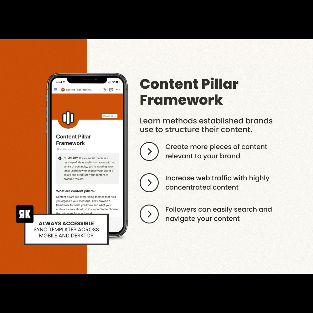 Learn how to choose your brand's pillars and structure your content around them for maximum results. Have you ever thought... "My content is too scattered""I talk about a lot of things""My posts feel like random thoughts and ideas" Or, how about... "I never know what to post""I can't find the right inspiration""I'm not sure how my content should look" Don't worry. All of those thoughts are normal. Even the best creators started with these thoughts. But wishing won't make them go away or fix your content. Only strategy and proper planning will. That's were we come in ✋😁 The Content Pillar Framework will help you plan content and cultivate engaged followers across our channels. Learn how you can make your entire social media strategy work better by choosing the right topics to talk about and building content around them instead of just randomly posting things you come across. Features 🖱️ Simple edits. User-friendly drag and drop interface 📄 PDF format. Save and export this template as a PDF ♾️ Lifetime updates. New updates added