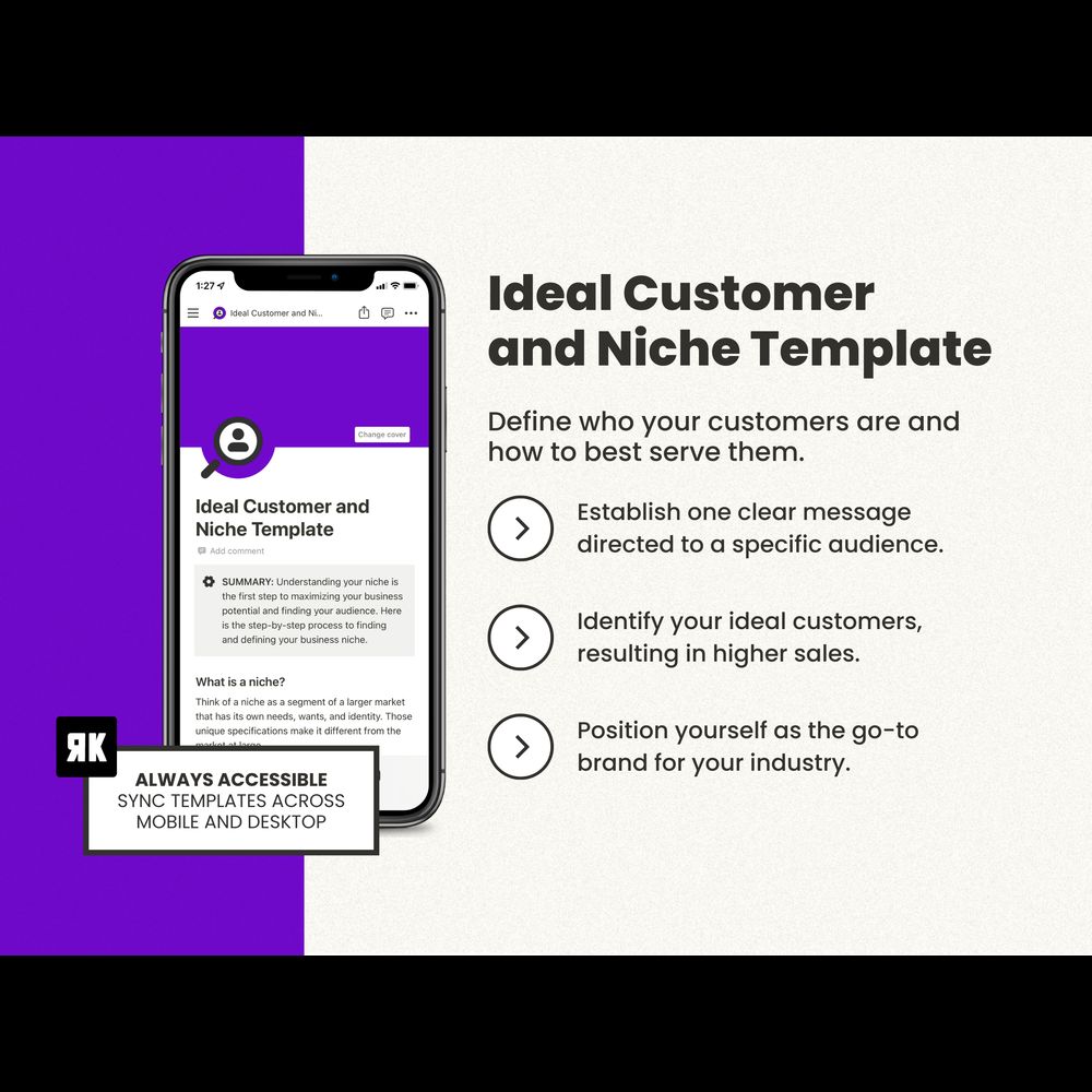 Selling your products to everyone is a sure fire way to drive yourself crazy. Not knowing what your ideal customer looks like or where to find them will stop you in your tracks before you've even begin your business. How do you start if you can't find the people who would want to buy from you? You can't market effectively if you don't know who your audience is. This template delivers a step-by-step process to define and target your niche. It covers knowing your ideal customer, how to brainstorm niche ideas and how to narrow down your idea list. Features 🖱️ Simple edits. User-friendly drag and drop interface 📄 PDF format. Save and export this template as a PDF ♾️ Lifetime updates. New updates added How to use in Notion This template works for both free and pro Notion users. Open the template link, then click "Duplicate" on the top right corner to duplicate it to your personal workspace. FAQs Q: How do I access my content? After completing the checkout process you will receive instant access to the templates. You can download it directly from your order page and you still receive a copy of your files via email for future reference. Q: Do I need a Pro Notion account to edit the elements? Nope, you don't need a pro Notion account to add the templates. Templates are designed carefully to make it available for both the free and pro accounts. If you ever find any problems, we will be more than happy to help you solve them. Q: What can I customize? Everything! Text, images, color, logos, size, anything you need to make the template yours. Q: Contact and Support Our team is ready and willing to answer any questions you may have. Feel free to send us an email here and our team will get back to you as soon as possible.