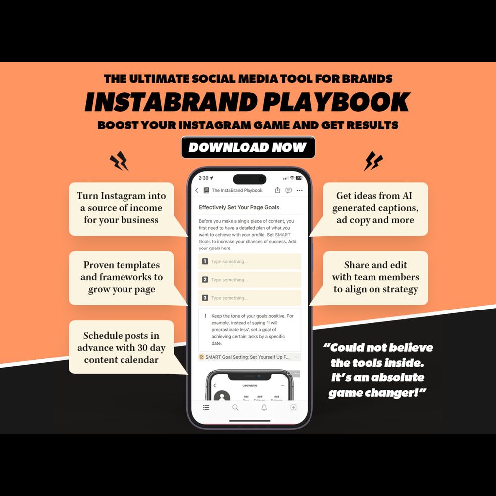 Struggling to make your Instagram account work for your business? Every successful Instagram page has a strategy built behind it. There's no way around the work of branding yourself, figuring out who your audience is, and creating content that brings them into your world. Most people skip those steps and get right to the fun part, creating content! In doing so, those accounts encounter these problems: -> Posting is inconsistent -> Frustrated by little to no growth or sales -> Waiting for content ideas and inspiration Do any of these sound familiar? An effective Instagram page cultivates a strong brand and positions you as the go-to authority in your field. Add value to your business with this in-depth InstaBrand Playbook. Solidify your brand and turn Instagram into a viable place to market your business! * P.S. No lorem ipsum is used in the Instagram Content Playbook - only real and relevant examples! What's Included Here’s what’s included in The InstaBrand Playbook: Supercharge your Instagram bio and set clear goals for your page: These will act as your north star as you plan and implement your social media strategy.Map your Instagram content with a clear strategy. Align your content strategy with consistent messaging and brand elements.Learn how to use competitive research, internal audits, and other techniques to pick the best markets to engage in.Set up a plan of attack to maximize your reach and build a customer base instead of just followers.Schedule your content a month in advance with the content calendar.Don't know what to post? Use the integrated AI generator to brainstorm content ideas, write Instagram captions, and develop effective copy to promote your products.