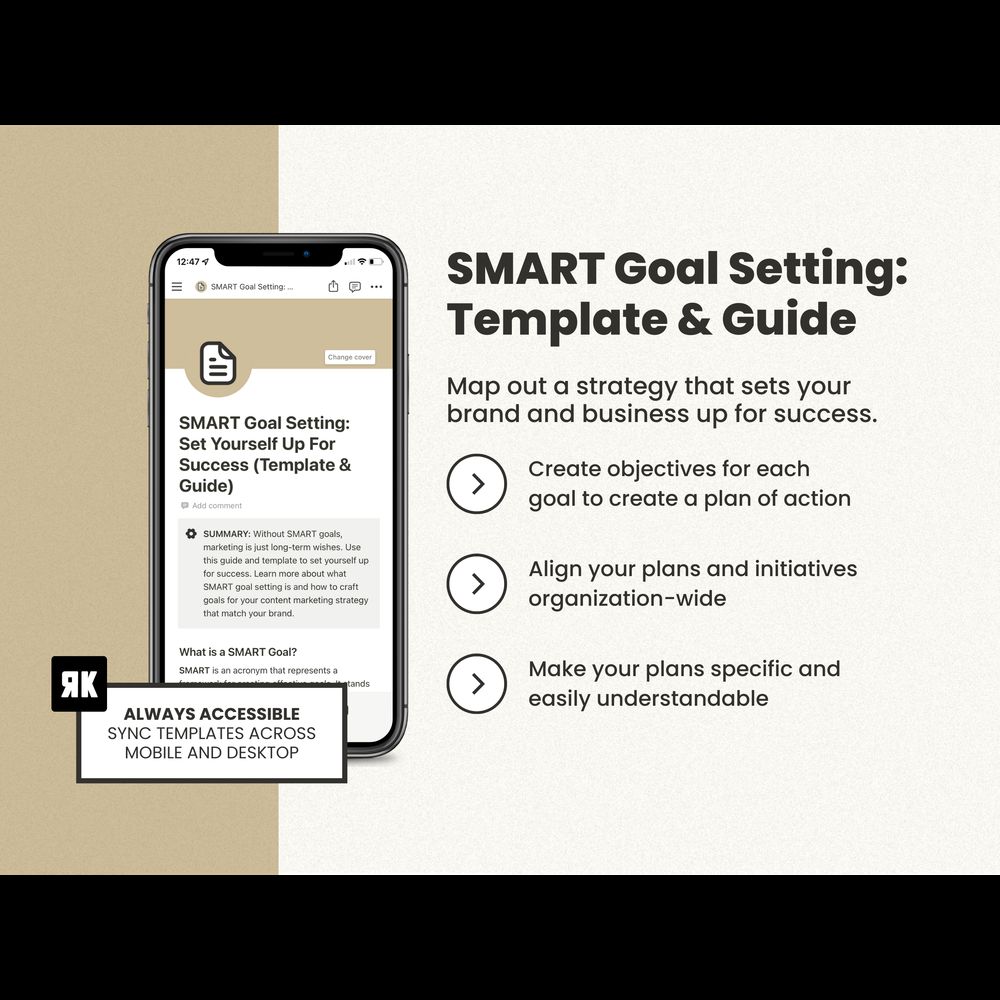 SMART goal setting helps make goals achievable. Maybe you've tried to set goals in the past but gave up quickly because it didn't feel like a concrete plan. What if, instead of feelings of defeat, you felt empowered because someone showed you how to develop SMART goals that matched your content strategy? What if they also provided a template & lesson so you could see them in action? Yea, that's us ✋😁 Learn more about what SMART goal setting is, why it's important and why it's essential for your business strategy. Have access to a template and guide that walks you through every step of creating your own SMART goals. Features 🖱️ Simple edits. User-friendly drag and drop interface 📄 PDF format. Save and export this template as a PDF ♾️ Lifetime updates. New updates added